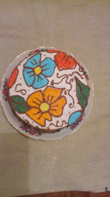 Вам надо почитать, посмотреть картинки о сочитаемости цветов. Как можно было на голубом торте сделать красную надпись на оранжевом фоне!?