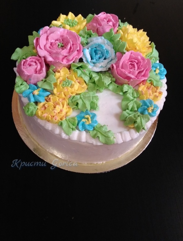 Проба пераучусь,сама... сладкое не едят- сделала маленький тортик,насадок нужных нет- из того,что было... шоколадный с малиной и сливочно-творожный крем..вообщем как-то так(