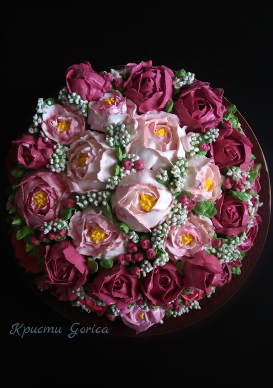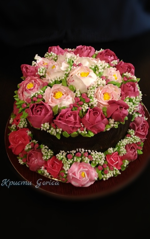 не получается у меня как у всех цветы( видимо насадки срочно надо искать.... нижний ярус цветов- мокрое безе,верхние с маслом.крем тоже нужно искать другой..