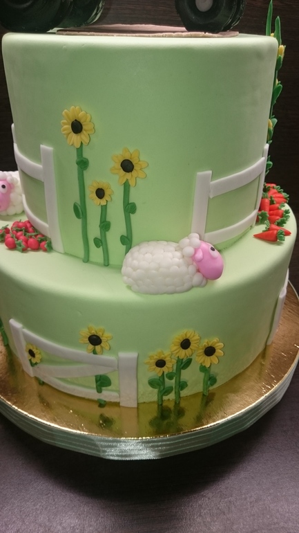 А это шоколадный медовик с трюфельным кремом и вишней. Диаметры ярусов 24 и 16. Высота нижнего 9 см, верхнего 13см. Вышел ровно 5 кг. Трактор сьедобный( внутри вкусные вафли) поехал он отдельно от тортика. Поставила просто что бы сделать фото.