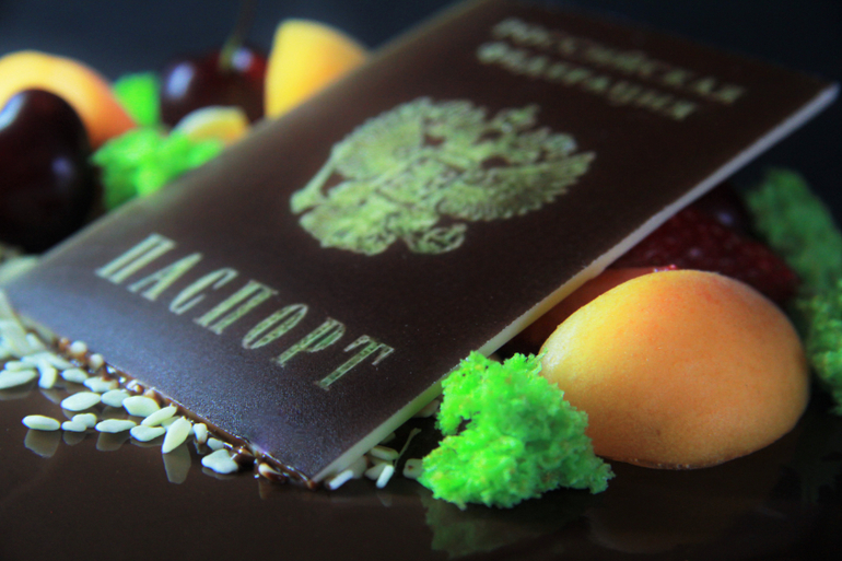 Шоколадный бисквит, малиновое желе, малиновый мусс, мусс из горького шоколада, шоколадная глазурь, ягоды и шоколадный паспорт))) Я так и вижу фото, на котором мальчик ест свой паспорт