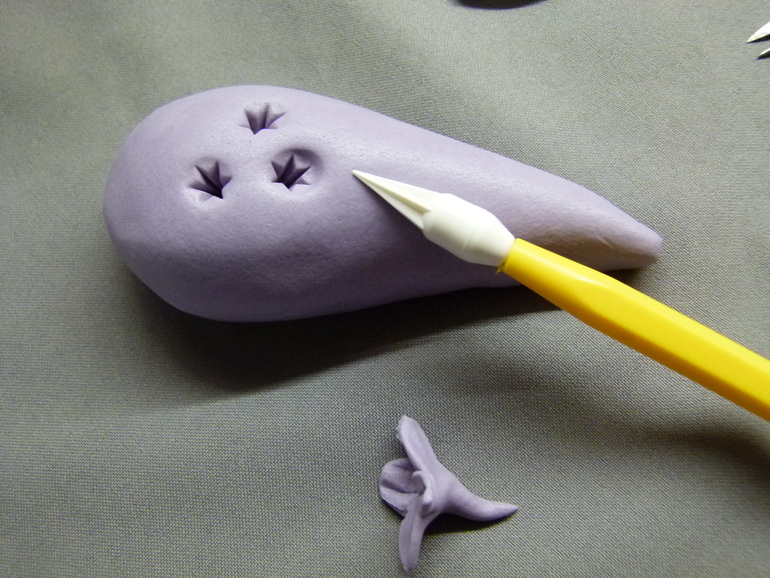 затем формирую основу в виде груши, можно полностью из мастики , можно добавив во внутрь что - нибудь вкусное, и постепенно делая подобные отверстия креплю соцветия. двигаюсь всегда от основания к кончику