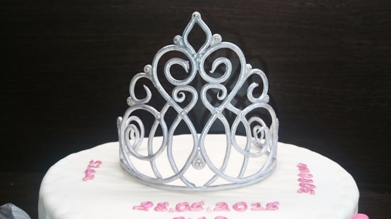 Начинка молочная девочка со сливками и клубникой. Очень понравилось лепить диадему и серебряный цветочек тоже неожиданно интересный получился)