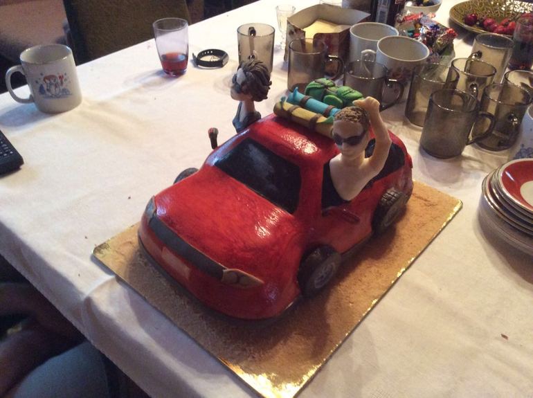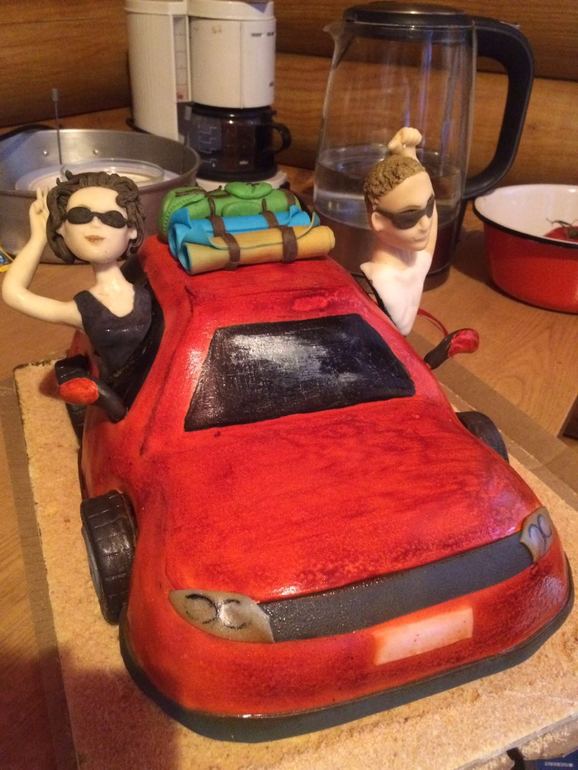 В кратце история такова: требовался торт-машина, из окон которого радостно машут водитель и пассажирка, на багажнике-походная атрибутика. автомобиль не обязан был быть сильно реалистичен, главное сюжет. Ничто не предвещало беды. Три дня я занималась этим тортом. Слепила симпатичных и реалистичных перонажей, сделала колеса, похожие на правду, собрала торт-машинку, обтянула, украсила деталями- похоже. И тут меня что-то дернуло покрыть ее для большей убедительности кандурином. На жаре на липкую мастику он лег не плавным слоем а грубыми резкими полосами. в панике я начала смывать все это кисточкой с водой, вроде исправила. время-два ночи, легла спать. в семь утра ожидался заказчик. просыпаюсь, смотрю при дневном свете-страхота (Слепну я что-ли? Вот ничего в ночи не вижу, правда) заказчик, отписался, что будет в 9. в панике я понеслась к подруге за аерографом. Попыталась исправить ситуацию, но намного лучше не стало, увы. Аерографом я не умею пользоваться, честно скажу, он толком не закрасил разводы и краска на потевший торт ложилась не равномерно. Доделывала я торт при заказчике. На их месте, я была бы в ужасе: бардак на кухне, всклокоченный кондитер, все кругом в краске. Зафотать это безобразие я не успела. Вручила торт с неачественным покрытием, в разобранном виде, с расчлененными персонажами с торчащей из них арматурой, которых просто не успела вставить. Денег за торт не взяла. Однако, деликатная девушка сказала что тортик очень милый (какой там милый!) и перевела мне денег на карту. Я ей их обратно. Так мы пофутболили деньги туда-сюда. Сошлись на половине, хотя у меня ощущение, что я еще приплатить за моральный ущерб должна.
