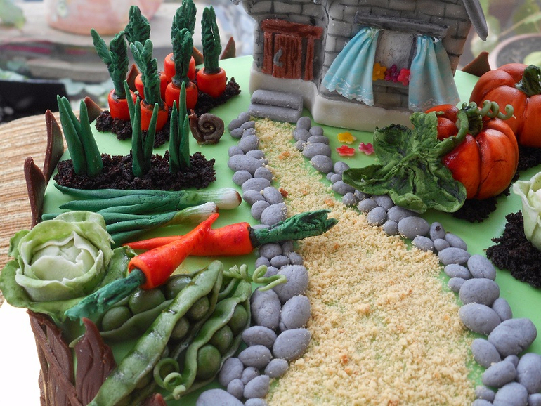 Планировался просто тортик, чтобы приятно сделать, можно было и не лепить ни чего, но мне хочется) вот и решила оторваться)) Сначала должен был быть просто огород, попробовать капусту, тыкву, горох хотела, а в конце, когда уже все овощи были готовы и осталось их только разложить по местам, муж про домик напомнил (я когда искала идеи показывала ему несколько картинок с домиком), а где домик, а нет его, забыла я про него совсем, а надо ж домик то))) У меня оставался бисквит, бугорки с коржей срезала, быстро соорудила из них подобие домика, смазав между собой кремом, в морозилку, потом обрезала ровно все уже на застывшем, мастикой покрыла, шторочки(!!!)(самое мое любимое в этом торте, они тончайшие получились, с кружавчиками)), цветочки, чуть кисточкой подтенила, кирпичики, на шпажку и в торт))) Любуюсь))))....