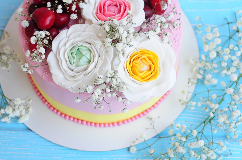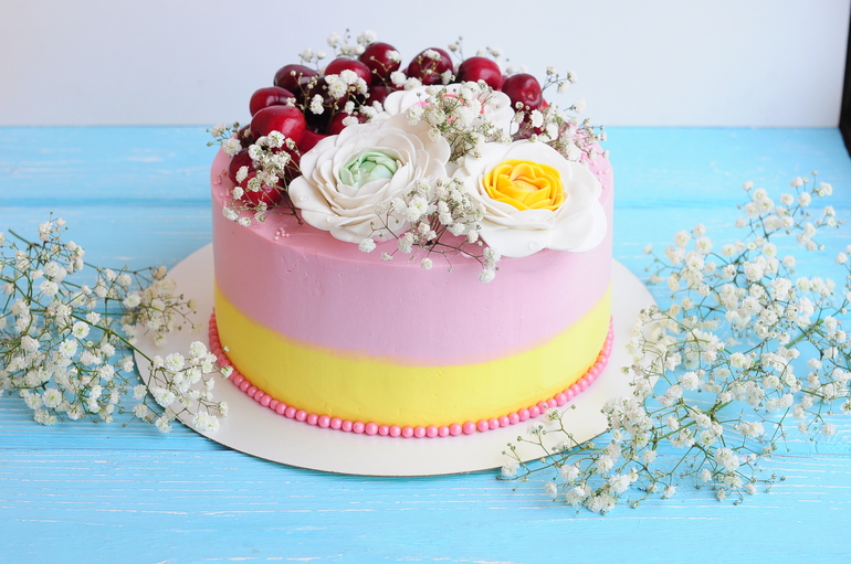 Это торт сюрприз на день рождения :) Хотелось сделать его и нежным и ярким...вобщем вот что получилось))
