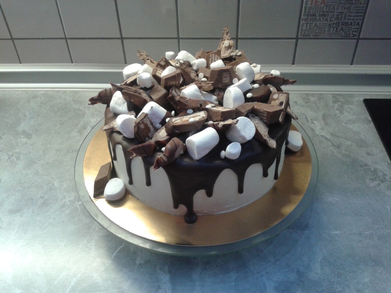 Вообще, это реально сложно выложить красиво! Кажется, ну что такого, покидал все подряд... А нет!) Тут проблема в том, что все двух цветов. Либо надо было раскладывать симметрично, либо полумесяцем как мне кажется. Может быть не весь торт заливать, а только часть. Либо потеки по кругу и венком выложить. Для завала всего торта нужно все таки разнообразие конфет. Но это мое мнение) Вот я первый раз делала)