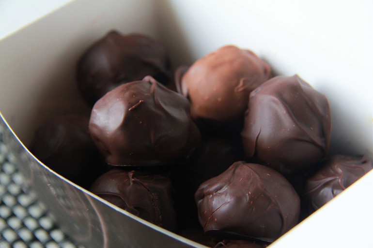 Трюфели: молочный шоколад-маракуйя в темном шоколаде и темный шоколад-Creme de Cassis в молочном шоколаде.
