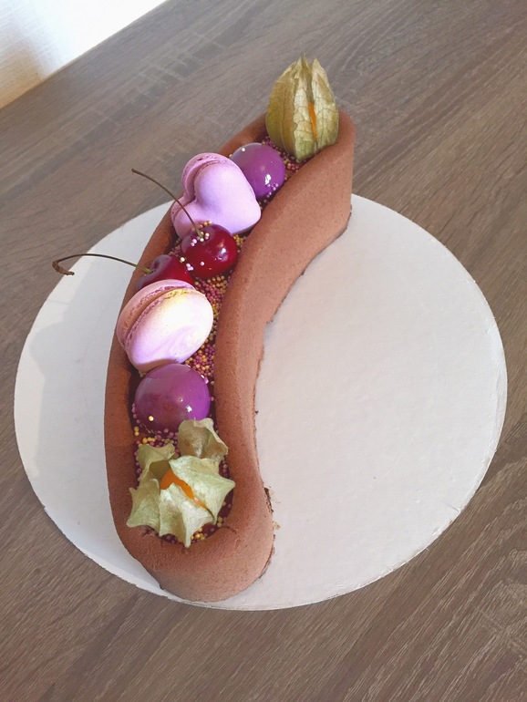 Шоколадный бисквит, крем и конфи из манго, мусс из ежевики. Покрыт шоколадным велюром.