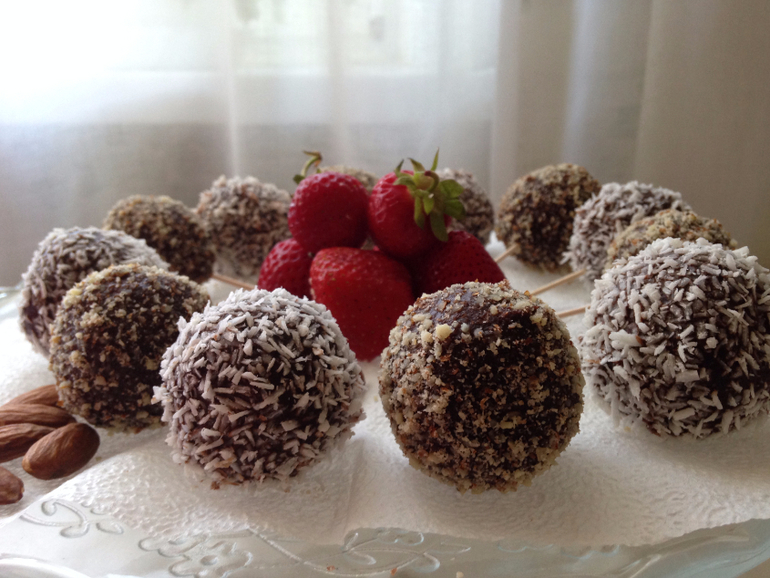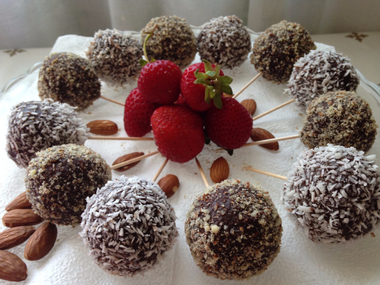 В следующий раз экспериментировала с начинкой тирамису: в шарике на палочке воссоздала полный состав любимого десерта. А сверху также темный шоколад и миндальная крошка/кокосовая стружка.