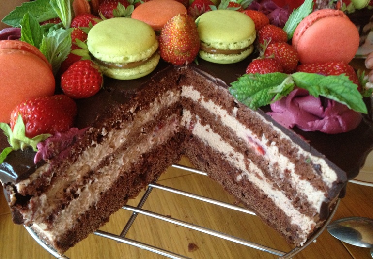Шокобисквит, крем сливки+сыр, свежая клубника и мята, шоколадная глазурь, кофейные макарон.