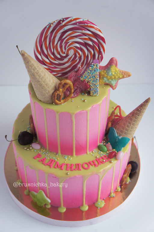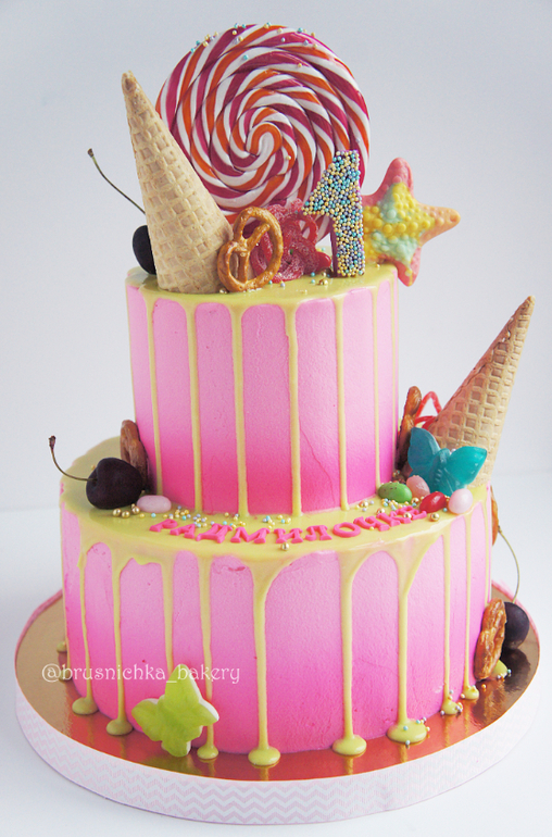 Украшение тортов кремом,шоколадом, фруктамиМолочная девочка с сырным кремом и клубникой в нижнем и с карамелью в верхнем.5кг