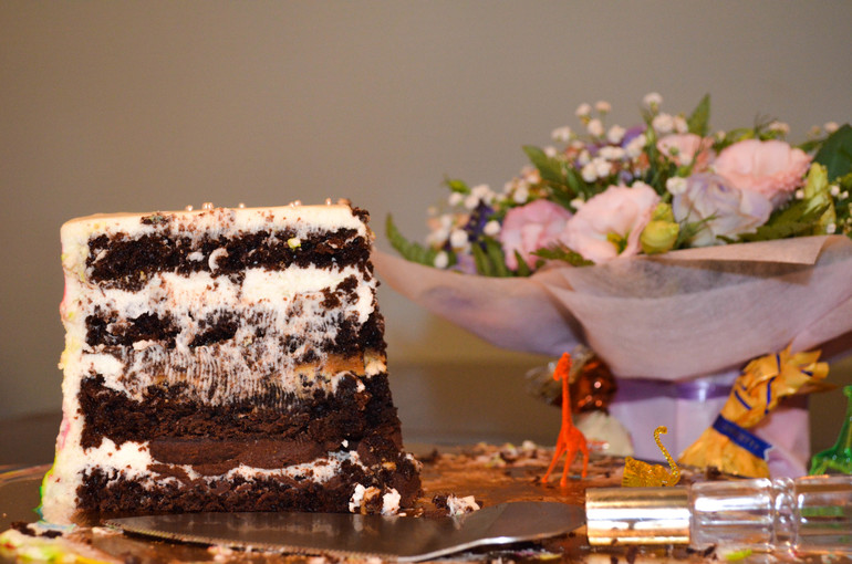 Шоко бисквит, ганаш карамель, сырный крем. Умяли его быстро
