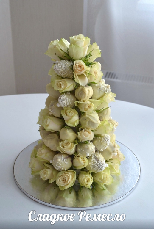 Здесь примерно 30 шт. клубники и 40 шт. роз. Цветы я покупала в обычном цветочном магазине. Заказ был срочным, некогда было заказывать. Розы сами небольшие по размеру. Можно найти предложения в цветочных магазинах, где 10 шт. за 300 рублей и т. д. Но не всегда, особенно, если это в преддверии какого-либо праздника.