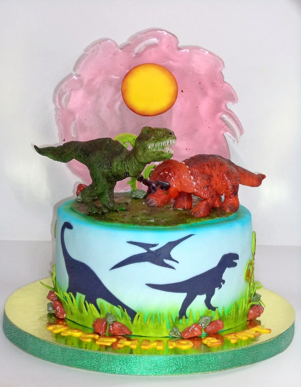 Торты детскиеС этим тортом случился у меня самый страшный сон кондитера. По своей глупости я сломала обе фигурки. Была очень сложная реанимация, вплоть до того, что тираннозавру пришлось вставлять заново все зубы, так что сильно за фигурки не ругайте, они буквально вернулись с того света. В фигурках только по одной шпажке в ноге, чистая мастика, вес 150 гр каждой, но теперь я ученая, шпажка длинной до подложки. Немного хромает выравнивание. Солнце подсмотрела у Е. Зотовой, за что ей большое "спасибо". Вес 2,9 кг.