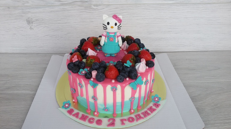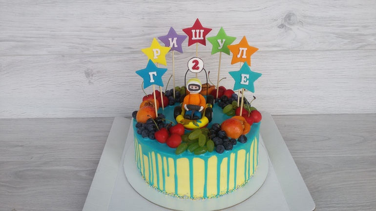 Безмастичный торт украшенный ягодами Сердечко с пандами
