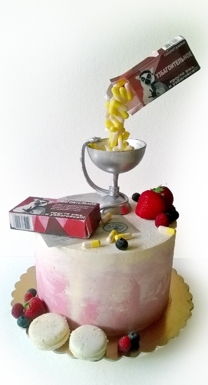 Собирательный образ идей заказчицы- главное: безмастичный, с разводами, для девушки, тематический декор (что-нибудь похожее на таблетки) ну и Узбагоительное в каком-нибудь виде) Вот что получилось) 2,5 кг. шоколадный шифон, фисташковый мусс, муслин классический и с черной смородиной , велюр, чаша из шоколада отлита, в таблетках порошок сахарной пудры, капсулы настоящие, макаруны в пачке узбагоина малина-имбирь, внизу в виде таблеток- кокосовые, ягоды садовые, пачки таблеток и рецепт вафельная бумага, змея- шоколадная масса для лепки.