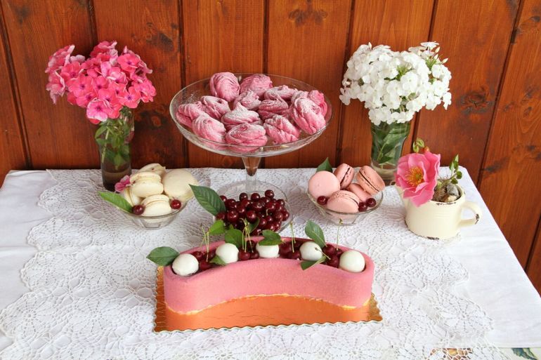 К нему сделала небольшой кенди-бар. макарони с начинкой из садовых ягод и ваниль-малина. попробовала себя в зефире на черной смородине.