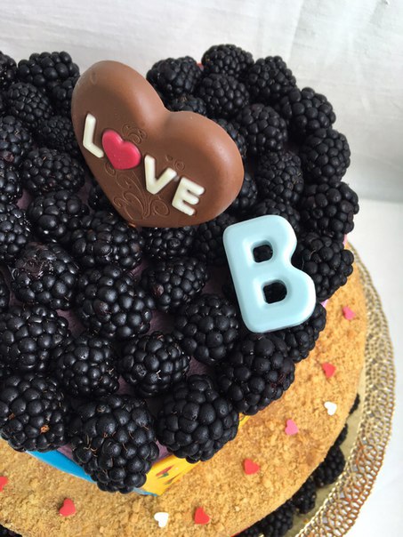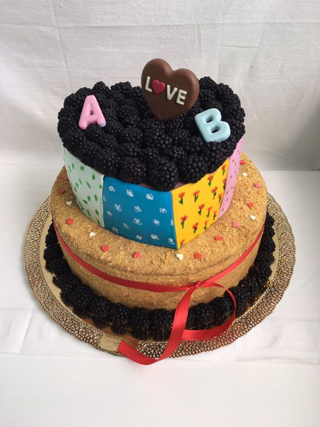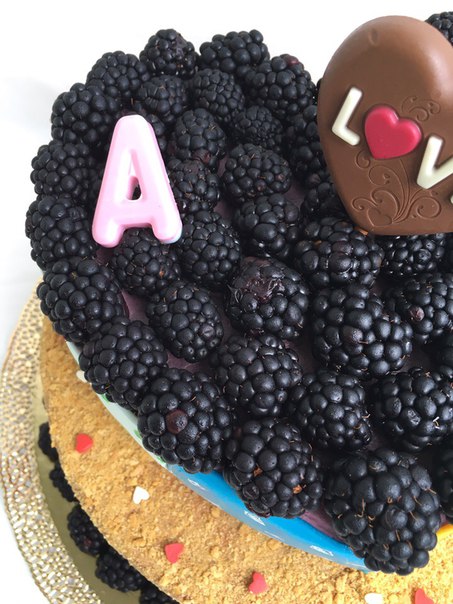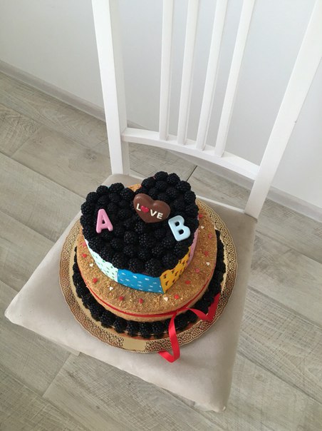 Вес тортика 5700 кг , низ диаметром 25 см и высотой 9 см , медовик с черносливом и грецкими орехами. Верх - сердце 18 см , высота 9 см , медовик с черничным кремом. Высота торта без декора 18 см.Украшен ежевикой и шоколадным декором.
