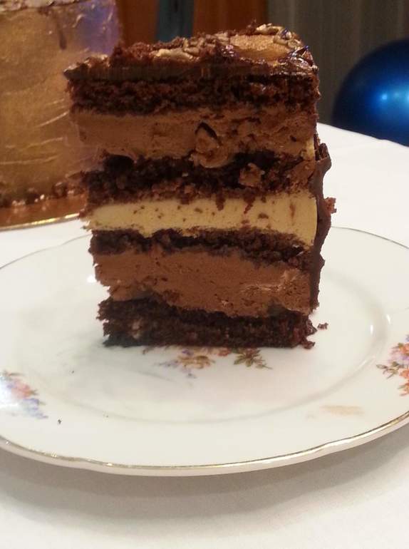 Внутри влажный шоколадный бисквит, крем тафита, карамелизированные грецкие орешки и кофейный мусс.