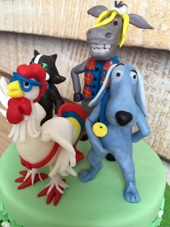 Замечательный тортик! Герои очень похожи) единственное,цвет мастики зеленой я бы сделала больше преближенной к велюру,так как он более теплый зеленый,а цвет мастики холодный