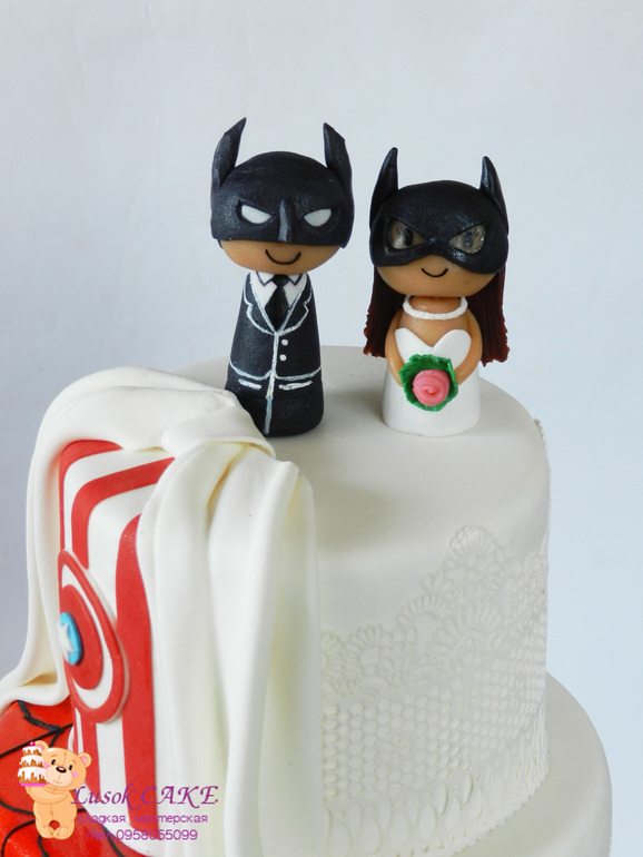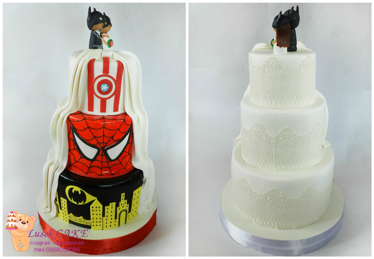 Думаю,многие видели такие тортики в интернете)Мне посчастливилось его сделать,очень креативная невеста попалась)Сделала жениху такой вот сюрприз,он просто обожает Супергероев. Пришлось помучаться,конечно...голова совсем не соображает по такой жаре,не укрепив нижний ярус,я поставила средний и пыталась нарисовать там человека паука и вдруг вижу,что нижний ярус начал проседать,меня аж в жар бросило,когда поняла в чем дело!Бегом снимать его,а не тут-то было,прилип намертво! В общем,еле отодрала! Чуть отошла от шока,пришла пора ставить верхний,в итоге произошла та же самая ситуация,я не укрепила средний ярус и уже поставила верхний....Кружева все пузырями,мастика мокрая(((короче,я седая....Пока гналась за высотой ярусов,вышел большой перевес,тортик нужен был 6-7кг,в итоге 8,6кг!!!!Надеюсь им было вкусно)