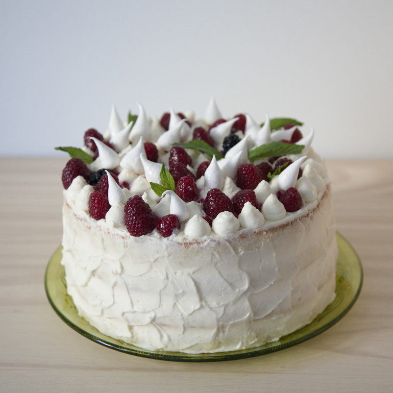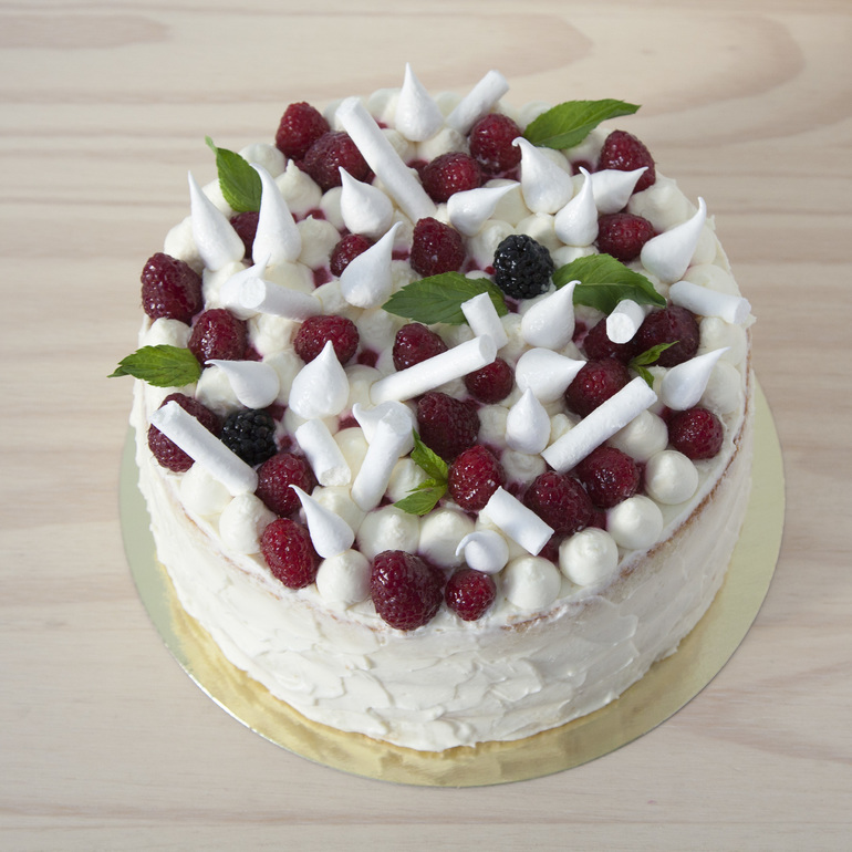 Внутри обычный бисквит от Эндишефа, пропитанный обычным сахарным сиропом с добавлением лимонного сока и самой капелюшечки цедры, кремчиз со сливками, на нижнем и под верхним слоем мармелад на пектине из малины, в середине свежая малина.