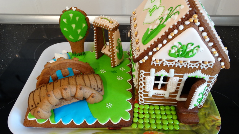 Спасибо. Мне казалось, детям будет очень интересно его съесть. А, нет. Им, как ни странно, тоже жалко ломать домик. Пока стоит украшает стол. Сейчас насмотрятся, а там и приговорят все к поеданию.