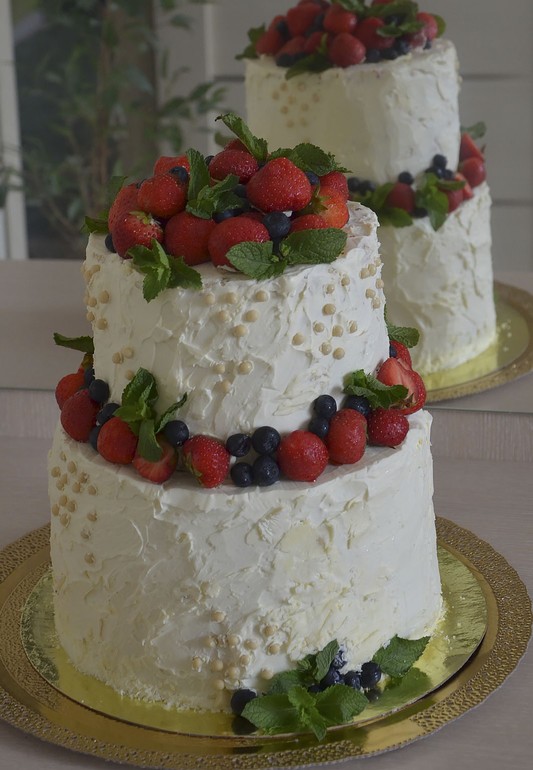 Украшение тортов кремом,шоколадом, фруктамиНижний ярус- стилизованный клубничный поцелуй (чередование клубничного творожного крема, пломбирного крема, клубничного желе с маковыми и ванильными бисквитными коржами), верхний ярус-ванильный бисквит, сливочно-творожный крем, свежая клубника, прослойка бисквитной крошки с карамелизированным лимоном,цитрусовый мармелад.Вес 6,3 кг.