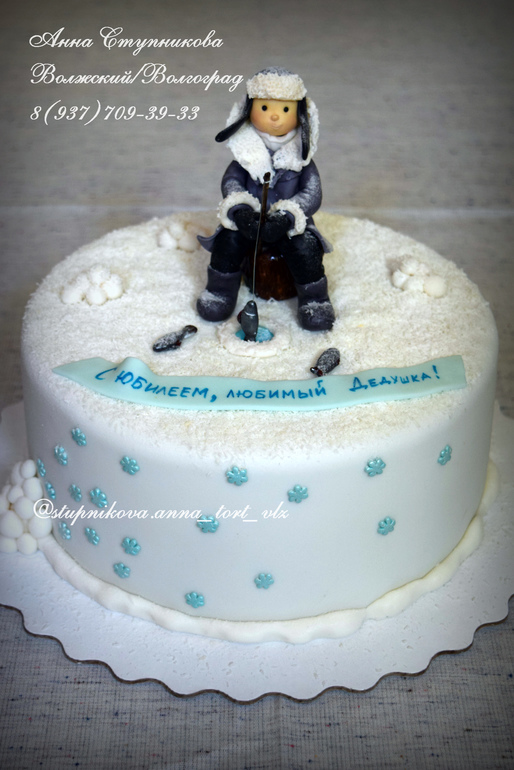 Забавный заказ летом)) но мужчина любит зимнюю рыбалку. Поэтому жару разбавил "холодный" тортик)) Рыбак под катом