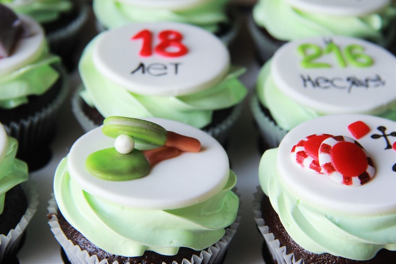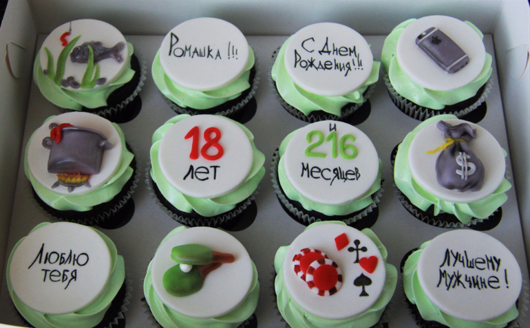 Заказали у меня капкейки для 36-летнего мужчины. При этом набор был таким: рыбалка, айфон, кухня, мешочек с деньгами, настольный теннис, покер. Вон, сколько интересов