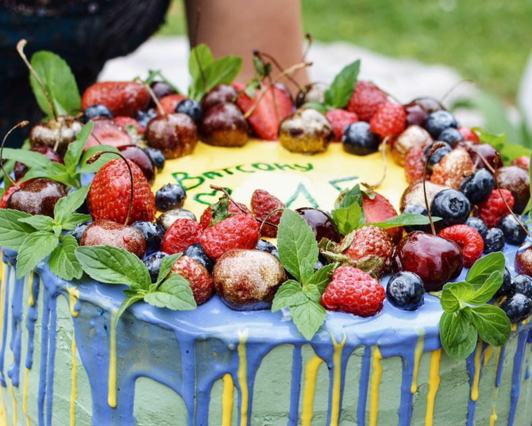 1-й бисквит на молоке, голубика, сливки, 2-й молочная девочка, сливки.