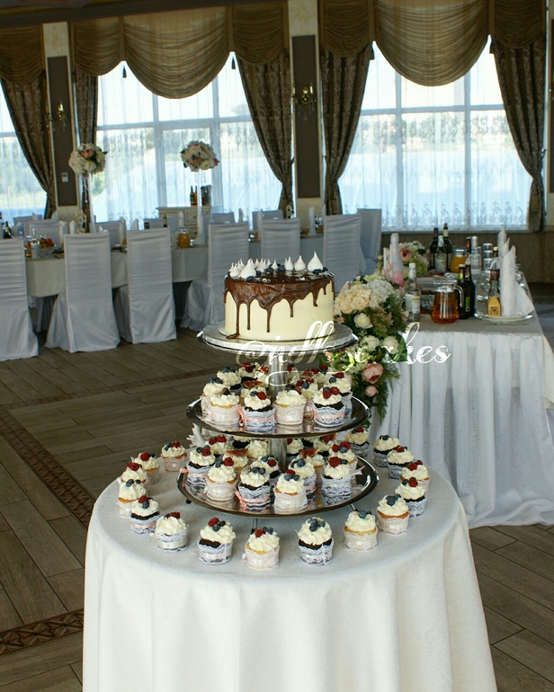 Кружева покупала невееста, я ей только метраж и высоту ленты сказала, чтоб по размеру подошло. Стаканчики конечно есть, я без них не пеку даже для своей семьи дома. Кружево не стало масляным, я украшала кремом за час до доставки. Крем на некоторых чуть поехал, когда я их в зале доставала из коробки, но ничего не замаслил. Крем на сливках был