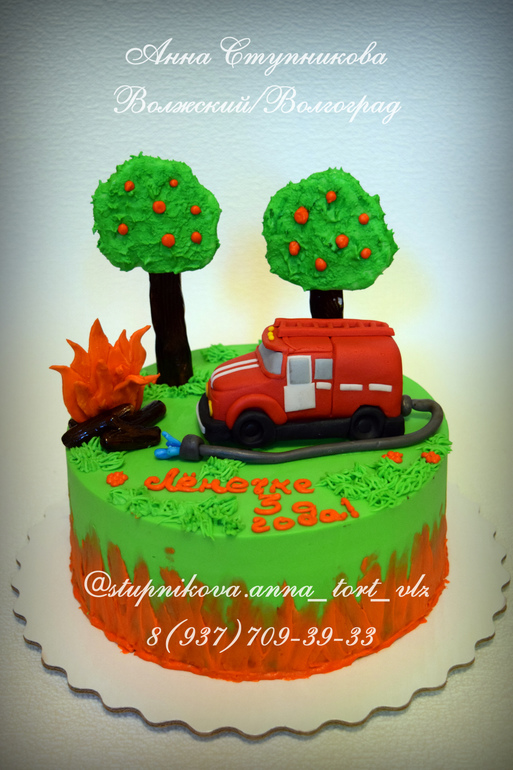 И торт с пожарной машиной. Машина не просохла и её повело на подпорках(( Рисовой массы не было, пришлось делать из куска мастики, соответственно тяжелая получилась...