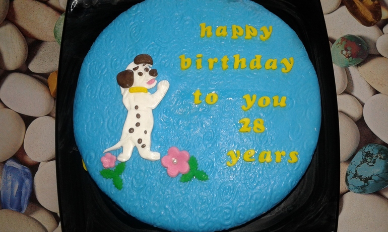 Я даже не могу сказать, т.к. аппликация такая... простенькая совсем) Явно не хватает теней. И цвета. Т.е. цвет сплошной везде. И цветы и листочки и собака. Поэтому плоско и очень просто выглядит.