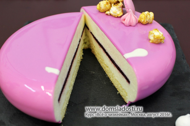 Внутри творожный мусс, смородиновая прослойка. Сверху гляссаж на сгущенном молоке и нейтральная глазурь, окрашенная диоксидом титана (белый пищевой краситель)