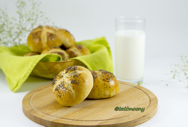 275 г муки, 165 г молока, 11 г свежих дрожжей, 0.5 ст.л. сахара, 0,5 ч.л. соли, 40 г сливочного масла. Тесто у меня делала хлебопечка Панасоник на режиме "Пицца". Заложить продукты в правильной последовательности для своей хлебопечки. В это время поставить духовку на 200 С, а внутри духовки греется камень для выпечки. Готовое тесто разделить на 9 кусочков, это приблизительно по 55 г. Сформировать шарики, поставить на расстойку на 30 минут. Затем сделать надрезы, смазать яйцом, я посыпала макой, можно кунжутом, семечками. Это кому как нравится. Выпекать 15 минут при 200 С. Хотела приготовить к супу, но суп не дождался, зато молоко дома закончилось.