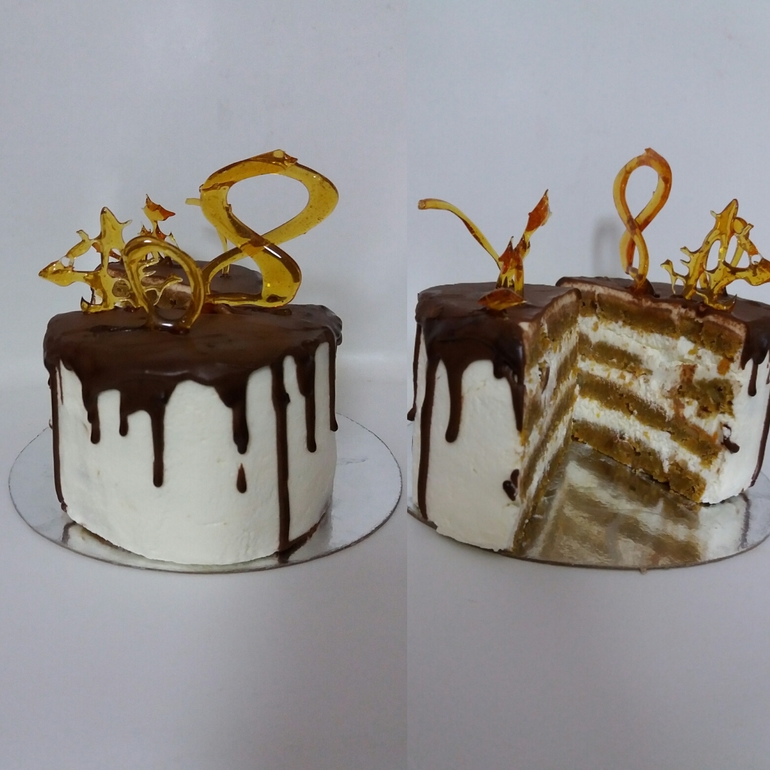 А это морковный торт-тренировка, глазурь хромает, училась ввравнивать и пробовала декор из карамели.