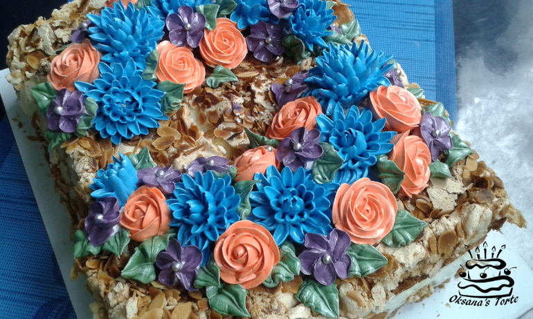 ой, я не знаю как он называется,могу только перечислить что там. Тесто на желтках,наверх безе и миндаль,так делаю два коржа. Между ними вишня с желейной прослойкой и сметанный крем))) .Вот и все,из за того что безе, я его даже не выравниваю,так и оставляю развалинами,насадила цветочки и все)))
