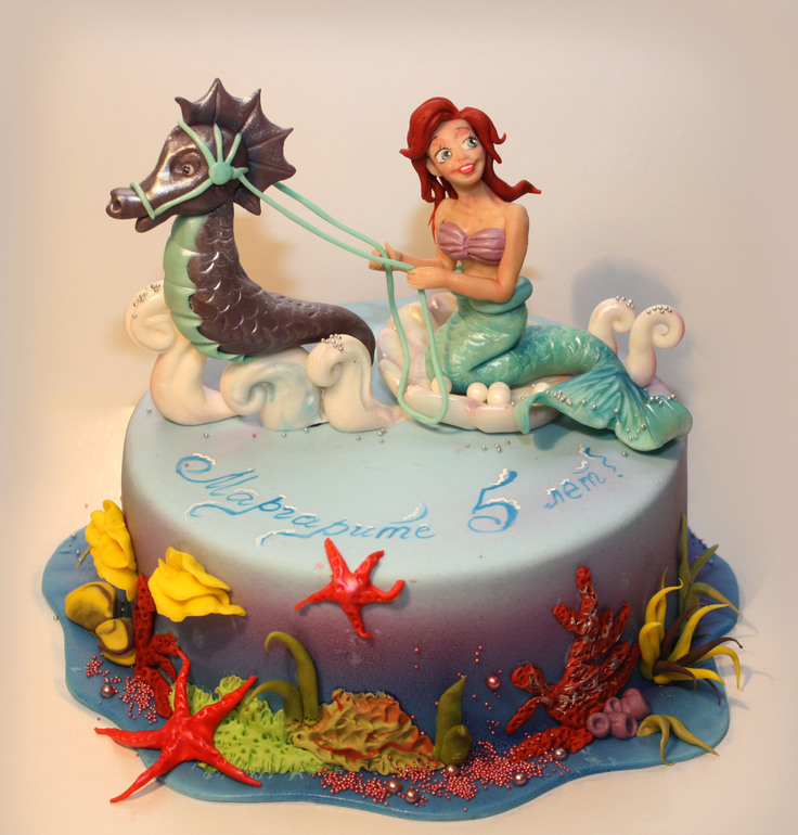 Торты детскиеСегодня Ариэль немного другая...на морском коньке везет жемчуг))где -то давно видела такую идею, понравилась, неизбитая))..к сожалению ,именинница заболела. но мама решила все же заказать доче торт, ведь День рождения у ребенка))))и она его очень ждет...поэтому постаралась сделать торт максимально живописным и ярким)