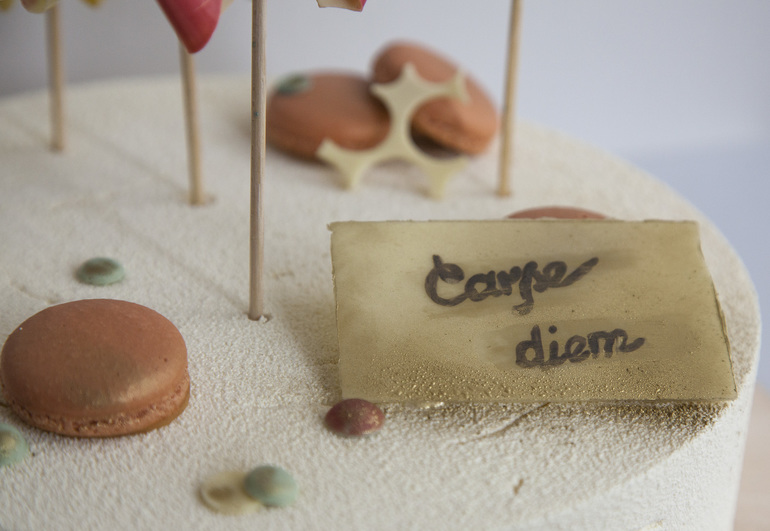 На шоколадной табличке надпись "Carpe diem" - "Лови момент"