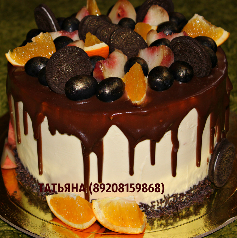Украшение тортов кремом,шоколадом, фруктамиВес примерно 3,5 кг, ванильный бисквит, сливочно- йогуртовый крем, свежий нектарин, банан, коньячная пропитка , разрезик подкат