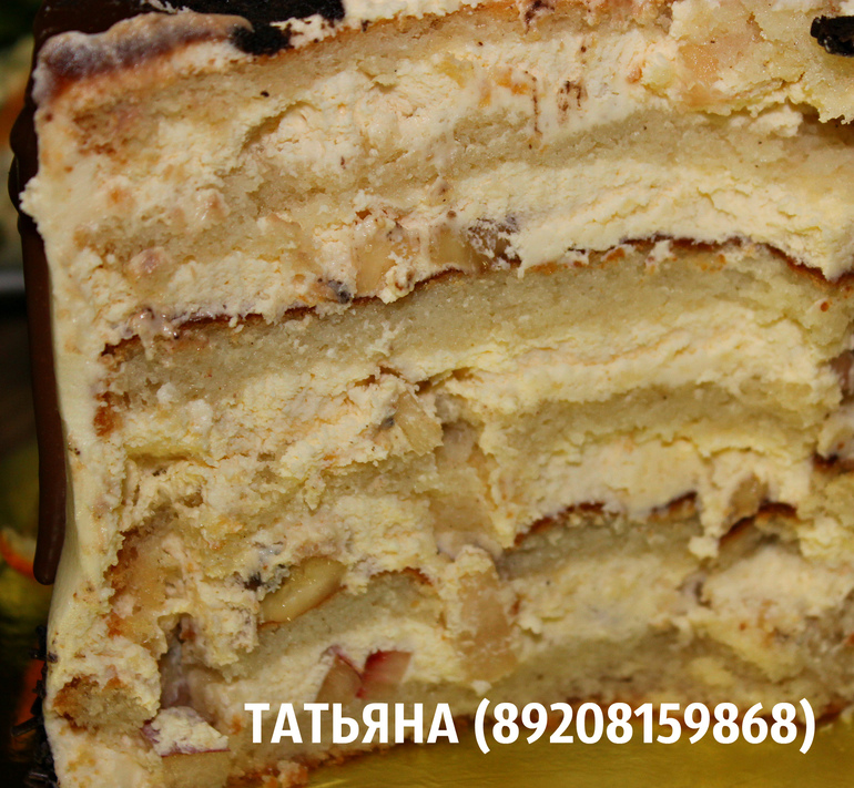 Вес примерно 3,5 кг, ванильный бисквит, сливочно- йогуртовый крем, свежий нектарин, банан, коньячная пропитка , разрезик подкат