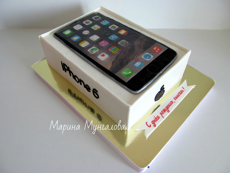 3. коробка с айфоном. внутри нежнейшая муссовая начинка "Шоколадное мороженое", много орехов. 20 порций, размеры торта 31*21. подложка 30*40.