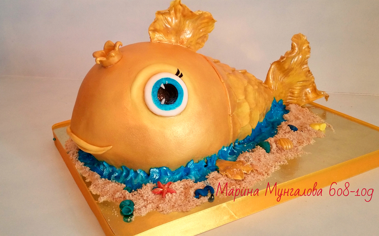 2. Золотая рыбка поздравляла девушку с 22-летием) Влюбилась в нее, честно! Внутри 18 порций "Сливочно-шоколадного лакомства" с гр.орехом. подложка 30*40.