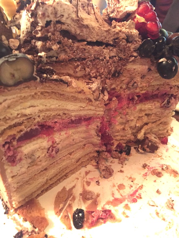 Украшение тортов кремом,шоколадом, фруктамиНаваяла что-то в стиле Дали;) Внутри медовик со сливочно-сметанным кремом вишней в киселе и прослойкой домашней карамели,разрез прилагается.