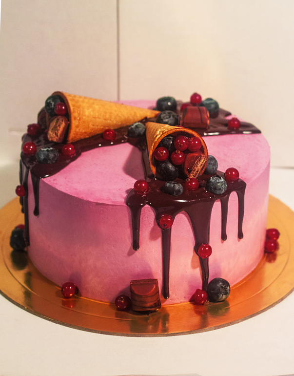 Украшение тортов кремом,шоколадом, фруктамиКлиентка попросила торт с ягодами, но чтобы не венок, а что-то новенькое) Решила сделать торт с вафельными рожками. Изначально должен был быть один большой рожок, но дороги домой в метро он не выдержал, поэтому использовала запасные мелкие) Делала и отдавала поздно вечером, поэтому фото на столе под лампой, но что делать) Вес 2,6кг.