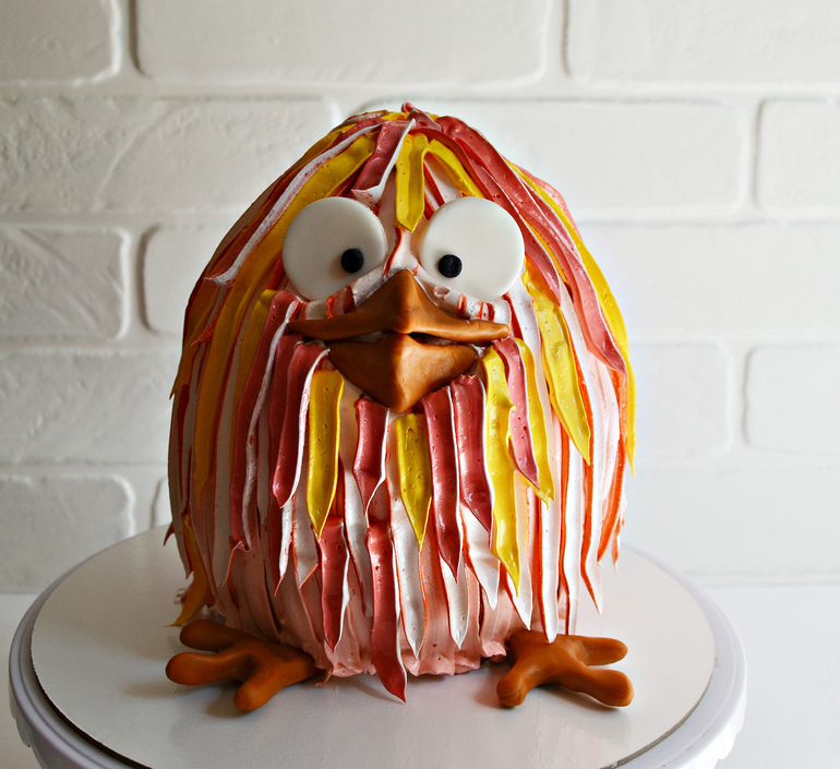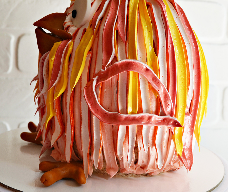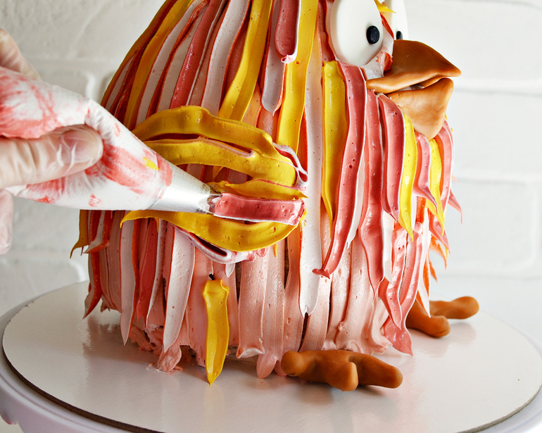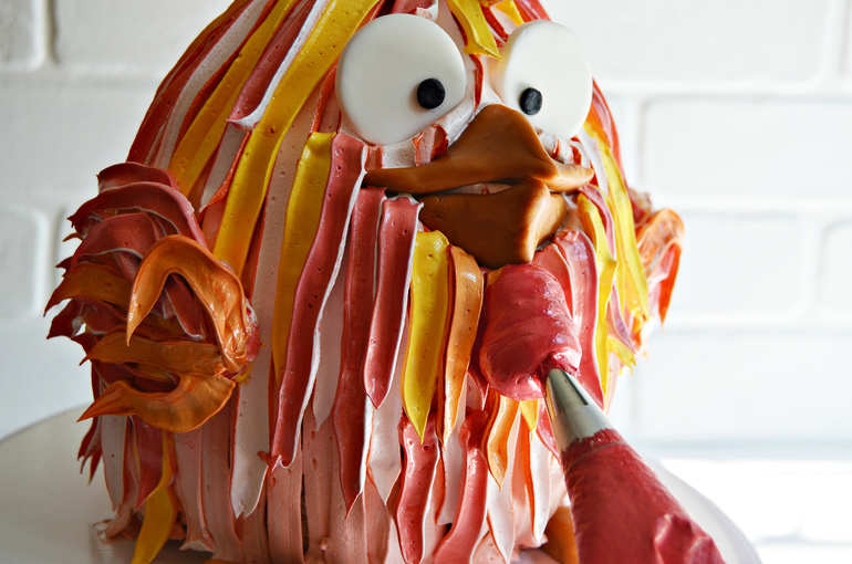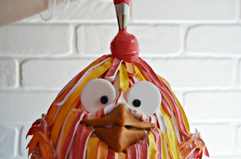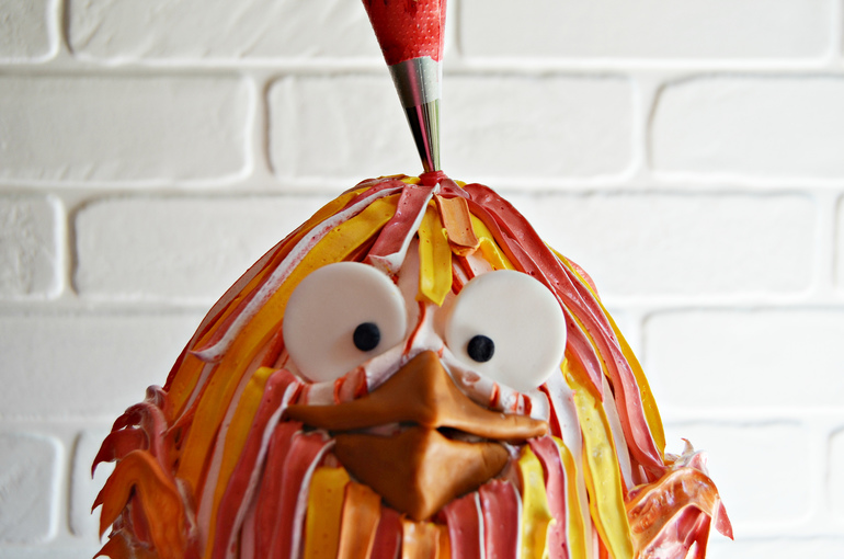 Добавьте «перья» из крема там, где необходимо. Петушок оживает.