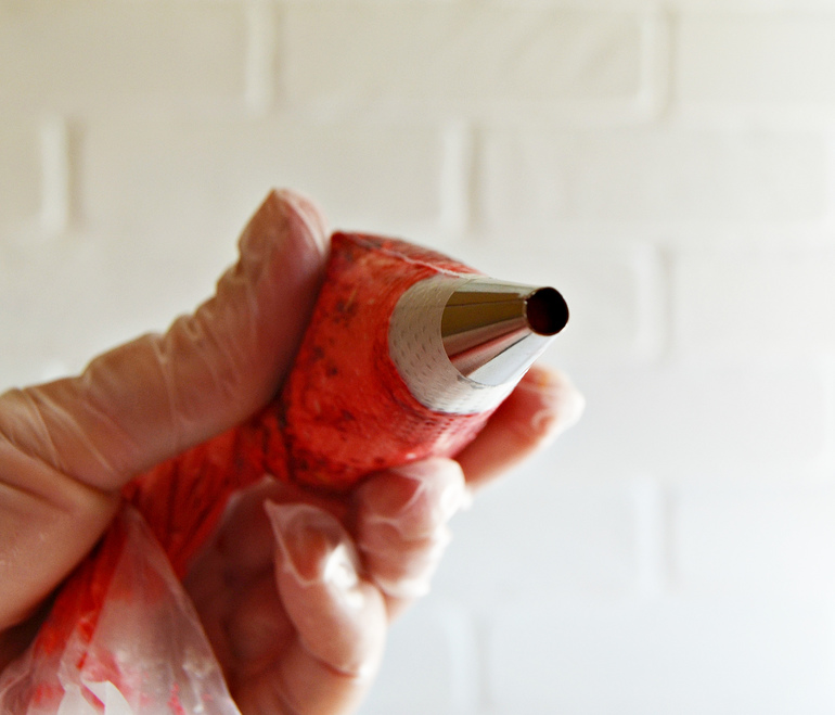 Вы можете воспользоваться насадкой «Лепесток розы» желаемого размера и оформить гребешок в виде рюши. Сейчас мы выполним их методом надувания. Возьмите насадку «Трубочка» и крем красного цвета.
