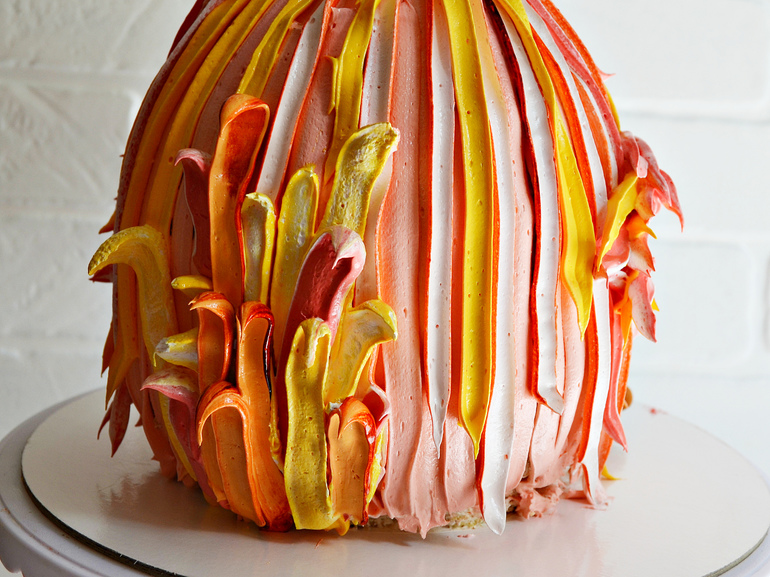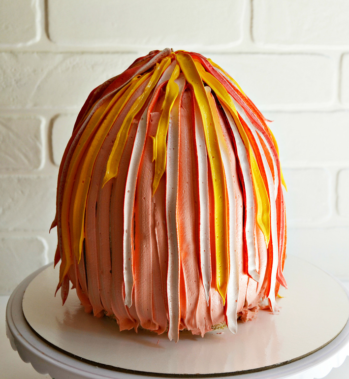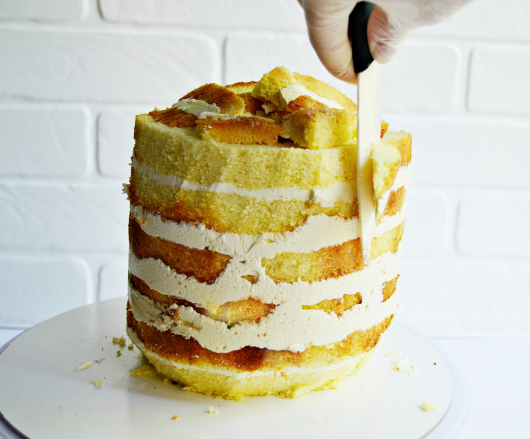Срежьте торт в верхней части. Из обрезков и крема соберите купол торта.